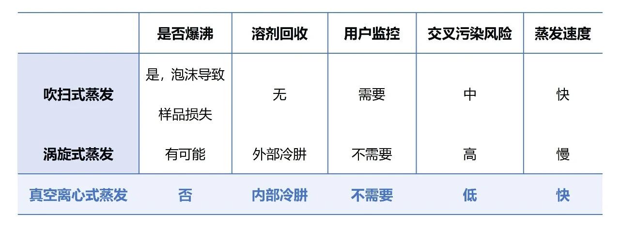 在样品制备方法的蒸发部分传统上依赖于使用旋转蒸发器,然而,它有许多操作缺陷。最大的缺点是旋转蒸发器是一个单样品系统,需要连续监测以控制过程并确保不发生起泡或暴沸。硝基呋喃样品通常以批次多样品的形式送达实验室,如果使用旋转蒸发器可以在有限的时间内处理小批量样品,那么处理大批量样品时很快就会变得无法处理。因此,实验人员针对吹扫式蒸发、涡式蒸发及真空离心式蒸发三种方式进行考察,结果如下: