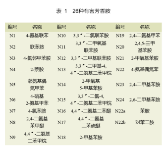 毒性芳香胺(表1)分子量较小,较易穿透细胞膜进入细胞核,变成活泼的亲电阳离子,与DNA中的亲核部位相互吸引,发生交联反应,使正常的遗传密码发生变异,或者芳香胺分子的扁平部位易插入DNA螺旋体的碱基对之间,使正常的DNA遗传密码发生变异,形成癌细胞。