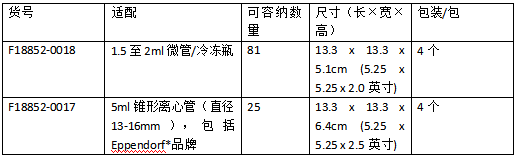 耐低温的塑料冻存盒有两个尺寸:可容纳81个1.5-2ml的微型管/冷冻瓶冻存盒和可容纳25个5ml的锥形离心管(包括Eppendorf 品牌)。